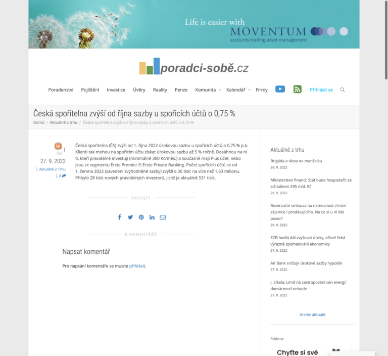Česká spořitelna (ČS) zvýší od 1. října 2022 úrokovou sazbu u spořicích účtů o 0,75 % p.b. Klienti tak mohou na...